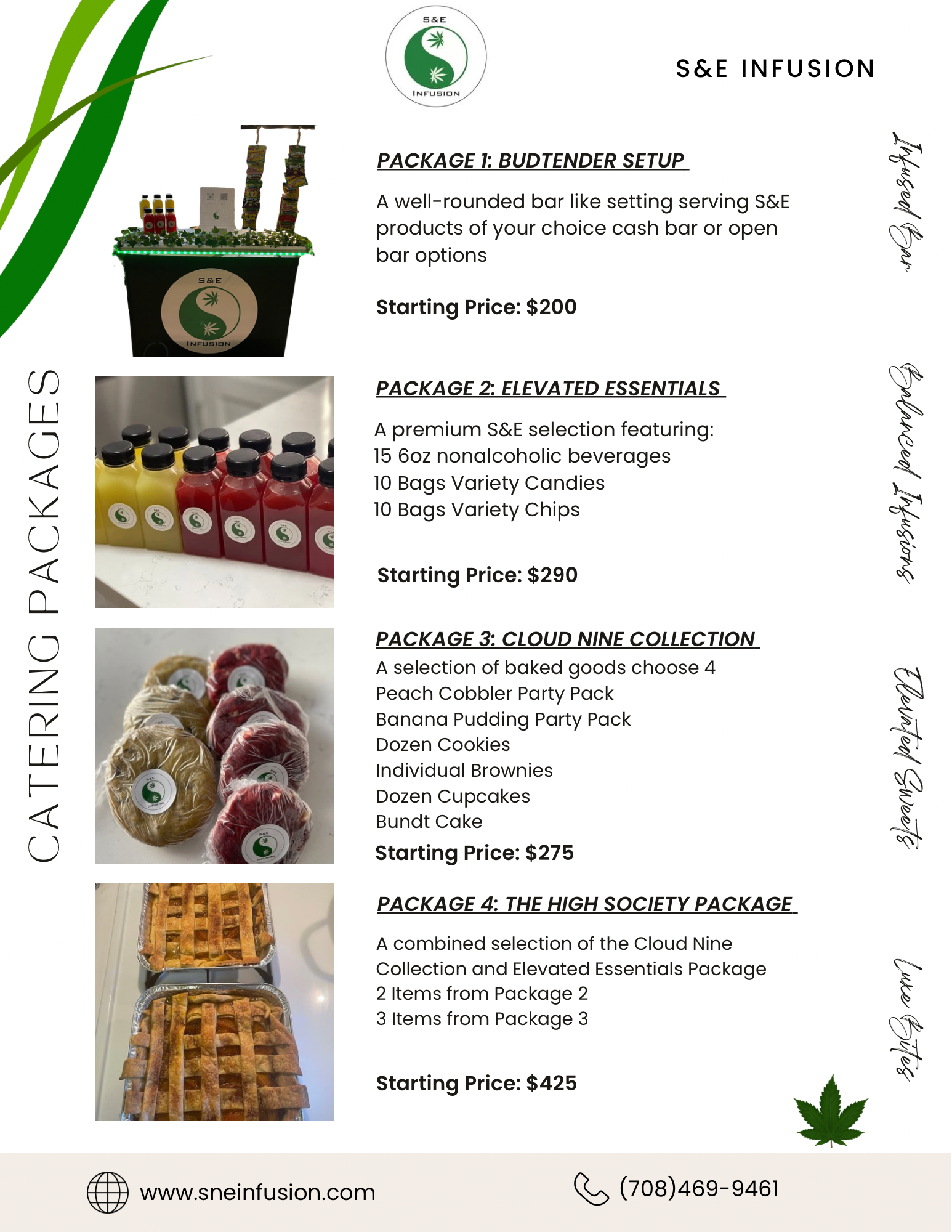 S&E Party Packs allow you a variety of our products. Great for parties or gatherings. We also offer Budtender service where we will serve S&E Products in a bar like setting giving you the option for a cash or open bar. Text 708-469-9461 for details